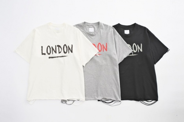しっかりした度詰め天竺に「LONDON」のラフさをイメージした手書き風のプリントと、ダメージ加工を施し着古したUSED感のあるプリントTEEです。若干ゆったりしたシルエットで、掠れプリントに合わせたダメージ加工がシンプルになりがちな夏のコーディネートや、上品なスタイルの外しとしてお使い頂けます。アウターのインナーなどにお使いいただく事で、裾から出てくるダメージ部分をアクセントとしてもお使いいただけます。