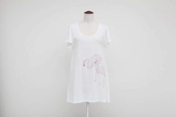 AラインシルエットのフレアTシャツに可愛らしいピンクフラミンゴをプリント。