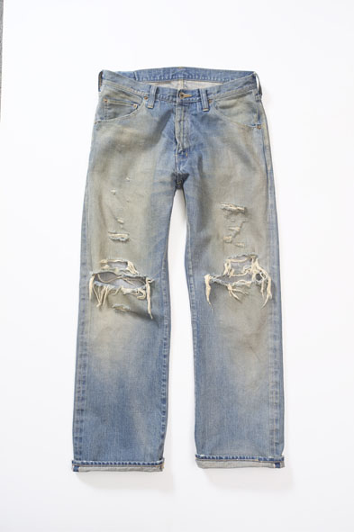 従来のデニムパンツよりも若干ルーズなシルエットとなっており、長年ハードに履き込んだ様な加工とダメージを加えています。ダメージに敢えてリペアは施さず、あくまで作り物では無く、履き込んだままの様な雰囲気を表現しています。